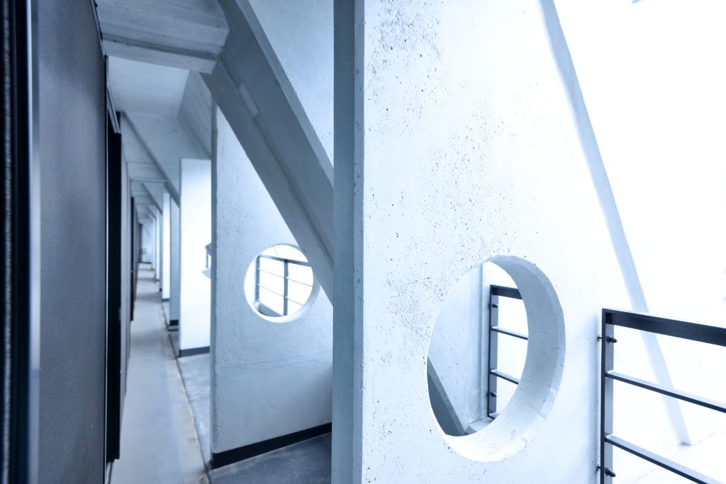 道路斜線制限によって上階の居室部分は斜めに削られているものの、西側の階段部分は削られておらず、まるでビルの横に細いビルが建っているかのような独特のデザインがここからよく見えます。