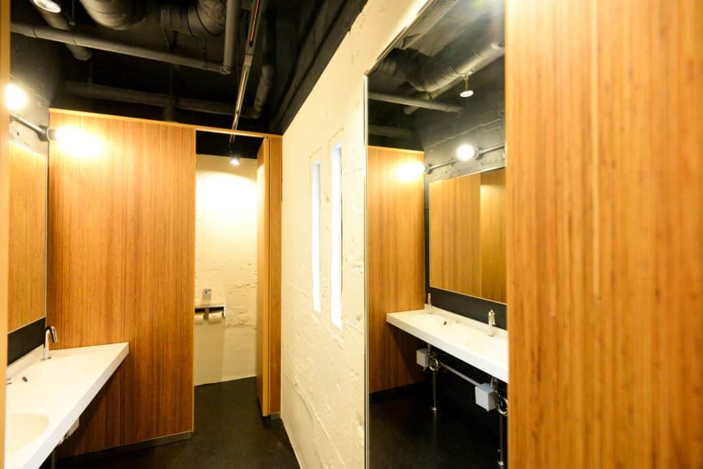 こちらも温もりを感じられるよう木質のデザインを採用し、オフィスビルのトイレとは思えない空間になっています。