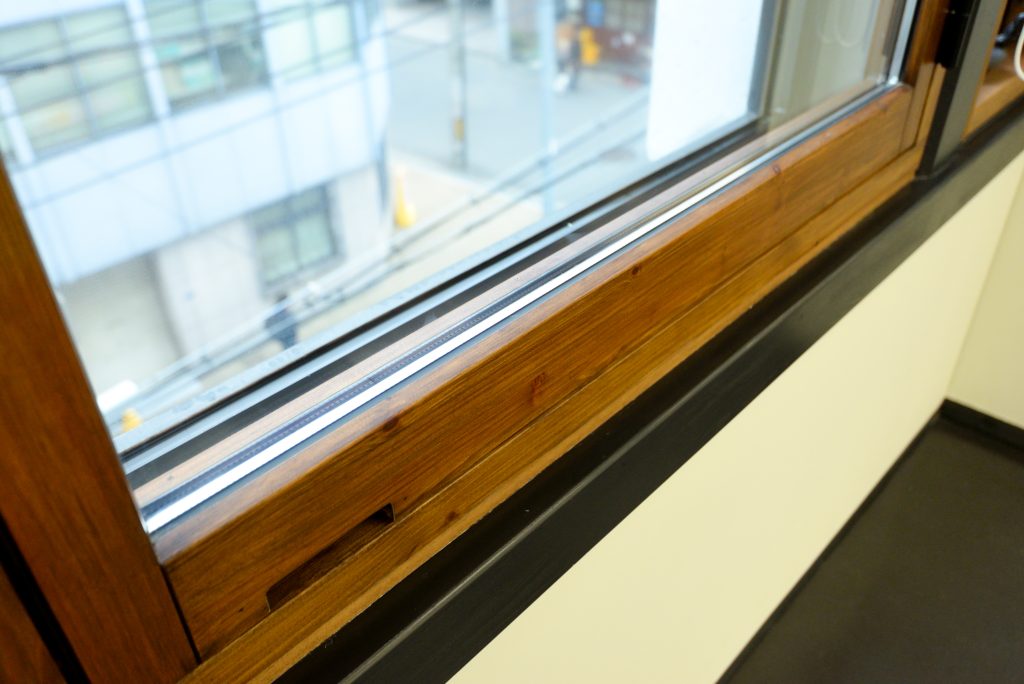 ゼノべの一端として、斜めに設えられていた高層階部分の窓の位置をセットバックし、複層ガラスの入った断熱性の高いサッシに変更。